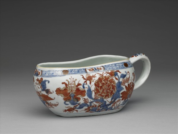 單把匜,整體器身呈橢圓形,中段朝內縮起,束口,微鼓腹,平底。口沿處帶一圈萬字錦地四瓣花紋,間飾朵花。腹壁以青花繪飾蜿蜒生長的枝葉,再以紅、赭彩描繪番蓮花、各式重瓣花與花苞等。把手上繪飾紅、藍交錯的葉紋圖案。器底光素無紋。