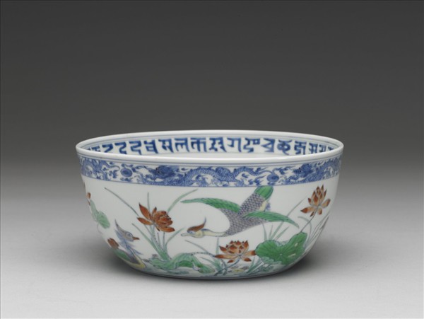 鬥彩梵文蓮塘鴛鴦紋碗