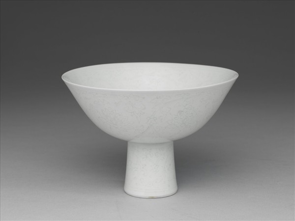 碗。侈口,深壁,高圈足。器內外壁及足壁均錐劃纏枝番蓮花紋,器外壁底邊近圈足處加飾蓮瓣紋一週。內底心印有「大清乾隆年製」雙圈楷書款。胎土潔白,質薄堅緻,釉色甜白。所謂的半脫胎技法,指器坯施甜白釉後,使用刮除大半胎骨的技法,薄胎骨使內外壁兩層釉面幾乎燒結一體,瑩徹透亮。