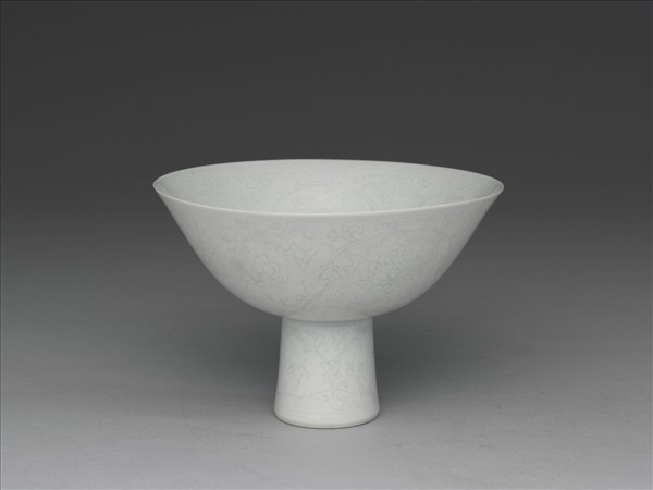 碗。侈口,深壁,高圈足。器內外壁及足壁均錐劃纏枝番蓮花紋,器外壁底邊近圈足處加飾蓮瓣紋一週。內底心印有「大清乾隆年製」雙圈楷書款。胎土潔白,質薄堅緻,釉色甜白。所謂的半脫胎技法,指器坯施甜白釉後,使用刮除大半胎骨的技法,薄胎骨使內外壁兩層釉面幾乎燒結一體,瑩徹透亮。