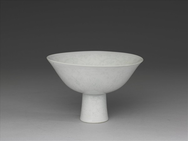 侈口,深壁,高圈足。胎質極薄,釉色甜白,內外壁及足均錐拱纏枝番蓮花,外壁底邊加飾蓮瓣紋一周。花紋均隱青色。碗心均有錐拱「大清乾隆年製」六楷字款。