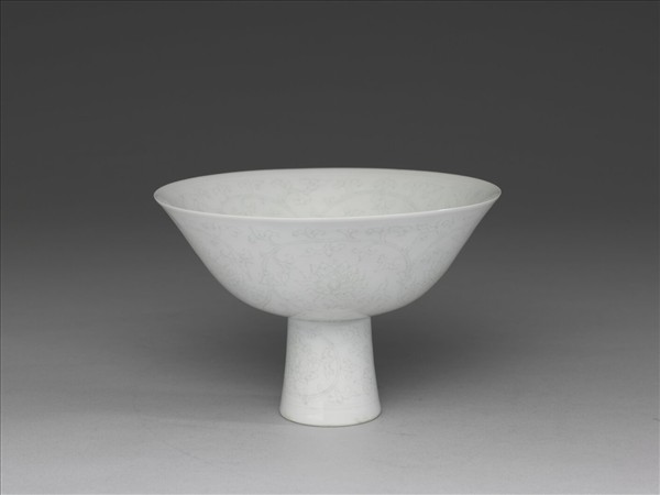 侈口,深壁,高圈足。胎質極薄,釉色甜白,內外壁及足均錐拱纏枝番蓮花,外壁底邊加飾蓮瓣紋一周。花紋均隱青色。碗心有錐拱「大清乾隆年製」六楷字款。