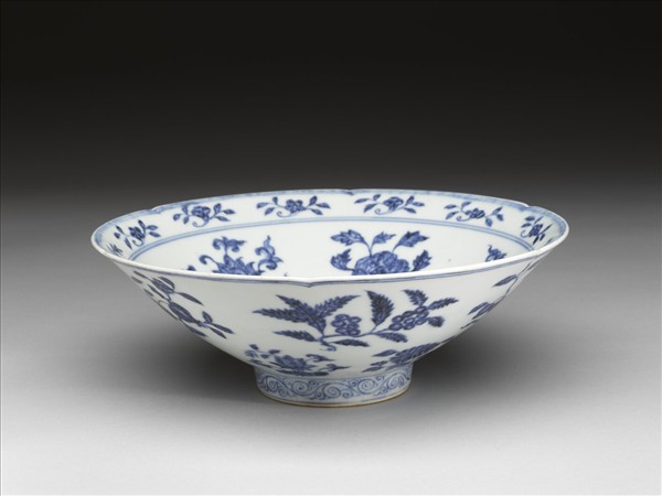 六瓣葵花形口,深壁,矮圈足。碗內口沿下兩道弦紋間畫各種花卉十二朵,內壁畫四季花卉六枝,底心三圈弦紋內畫桃實一枝。外壁口沿下弦紋兩道,器身畫折枝花、果分上下二層各六枝。足壁上下圈畫弦紋兩道,內飾卷草紋一周。底有青花書「大明宣德年製」六字二行楷款,外加雙圈。
