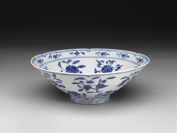 六瓣葵花形口,深壁,矮圈足。碗內口沿下兩道弦紋間畫各種花卉十二朵,內壁畫四季花卉六枝,底心三圈弦紋內畫桃實一枝。外壁口沿下弦紋兩道,器身畫折枝花、果分上下二層各六枝。足壁上下圈畫弦紋兩道,內飾卷草紋一周。底有青花書「大明宣德年製」六字二行楷款,外加雙圈。