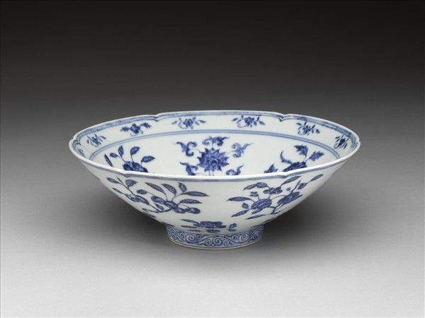 六瓣葵花形口,深壁,矮圈足。碗內口沿下兩道弦紋間畫各種花卉十二朵,內壁畫四季花卉六枝,底心三圈弦紋內畫桃實一枝。外壁口沿下弦紋兩道,器身畫折枝花、果分上下二層各六枝。足壁上下圈畫弦紋兩道,內飾卷草紋一周。底有青花書「大明宣德年製」六字二行楷款,外加雙圈。