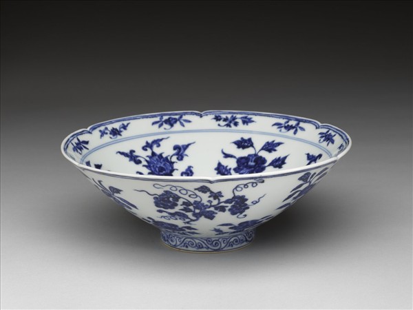 六瓣葵花形口,深壁,矮圈足。碗內口沿下兩道弦紋間畫各種花卉十二朵,內壁畫四季花卉六枝,底心三圈弦紋內畫桃實一枝。外壁口沿下弦紋兩道,器身畫折枝花、果分上下二層各六枝。足壁上下圈畫弦紋兩道,內飾卷草紋一周。底有青花書「大明宣德年製」六字二行楷款,外加雙圈。