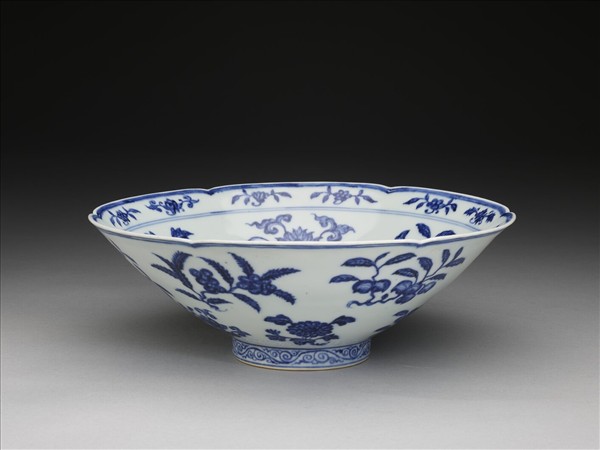 六瓣葵花形口,深壁,矮圈足。碗內口沿下兩道弦紋間畫各種花卉十二朵,內壁畫四季花卉六枝,底心三圈弦紋內畫桃實一枝。外壁口沿下弦紋兩道,器身畫折枝花、果分上下二層各六枝。足壁上下圈畫弦紋兩道,內飾卷草紋一周。底有青花書「大明宣德年製」六字二行楷款,外加雙圈。
