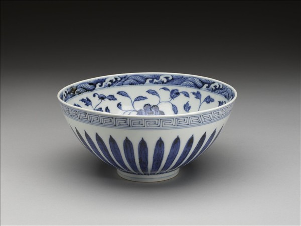 敞口,深壁上豐下斂,尖底,矮圈足,通稱「蓮子碗」。內口沿下畫波濤紋一周,加飾青線三道,周壁畫纏枝牡丹、菊花各三朵,碗心畫枇杷一枝,邊飾雙線。外口沿下畫回紋一周,加飾青線三道,周壁畫菊瓣紋,足飾青線二道。