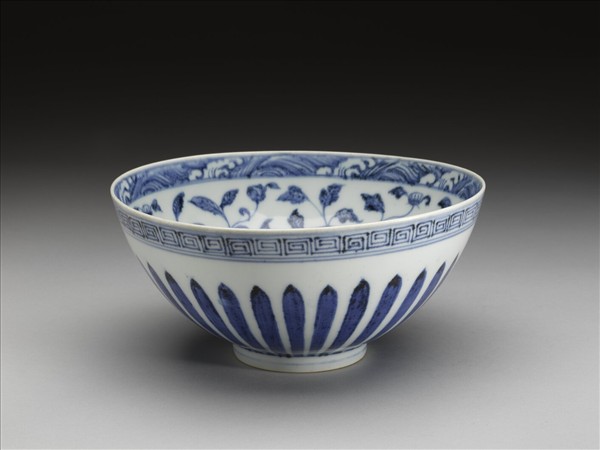 敞口,深壁上豐下斂,尖底,矮圈足,通稱「蓮子碗」。內口沿下畫波濤紋一周,加飾青線三道,周壁畫纏枝牡丹、菊花各三朵,碗心畫枇杷一枝,邊飾雙線。外口沿下畫回紋一周,加飾青線三道,周壁畫菊瓣紋,足飾青線二道。