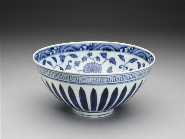 敞口,深壁上豐下斂,尖底,矮圈足,通稱「蓮子碗」。內口沿下畫波濤紋一周,加飾青線三道,周壁畫纏枝牡丹、菊花各三朵,碗心畫枇杷一枝,邊飾雙線。外口沿下畫回紋一周,加飾青線三道,周壁畫菊瓣紋,足飾青線二道。