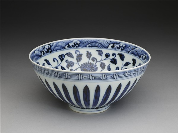 敞口,深壁上豐下斂,尖底,矮圈足,通稱「蓮子碗」。內口沿下畫波濤紋一周,加飾青線三道,周壁畫纏枝牡丹、菊花各三朵,碗心畫枇杷一枝,邊飾雙線。外口沿下畫回紋一周,加飾青線三道,周壁畫菊瓣紋,足飾青線二道。