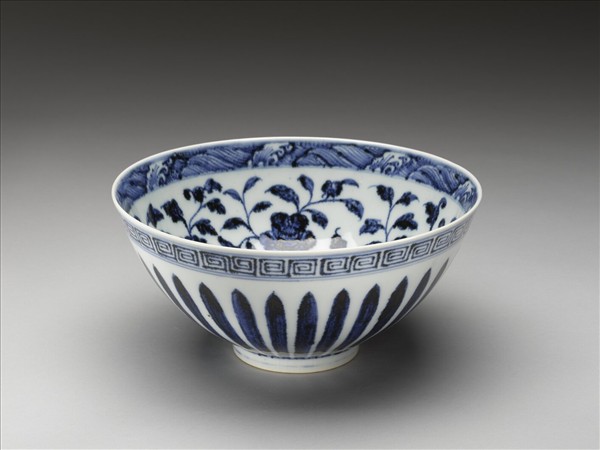 敞口,深壁上豐下斂,尖底,矮圈足,通稱「蓮子碗」。內口沿下畫波濤紋一周,加飾青線三道,周壁畫纏枝牡丹、菊花各三朵,碗心畫枇杷一枝,邊飾雙線。外口沿下畫回紋一周,加飾青線三道,周壁畫菊瓣紋,足飾青線二道。