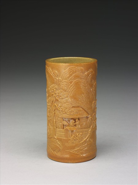 黃釉雕竹筆筒