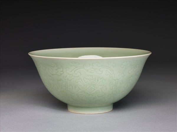 侈口窄唇,深壁,矮圈足。外壁淺劃纏枝花卉六朵,口足加飾淺線三道。內面樸素無紋飾。胎骨稍厚,通體翠青色釉。