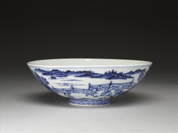 敞口,深壁,矮圈足。薄胎白釉。外壁畫庭園景物,十六孩童或坐或立嬉戲其間,足圈畫回紋一周,口足分飾青線五道。碗內純白,樸素無紋飾。