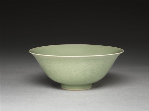 侈口窄唇,深壁,矮圈足。外壁淺劃纏枝花卉六朵,口足加飾淺線三道。內面樸素無紋飾。胎骨稍厚,通體翠青色釉。
