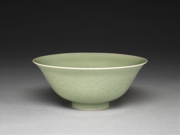 侈口窄唇,深壁,矮圈足。外壁淺劃纏枝花卉六朵,口足加飾淺線三道。內面樸素無紋飾。胎骨稍厚,通體翠青色釉。