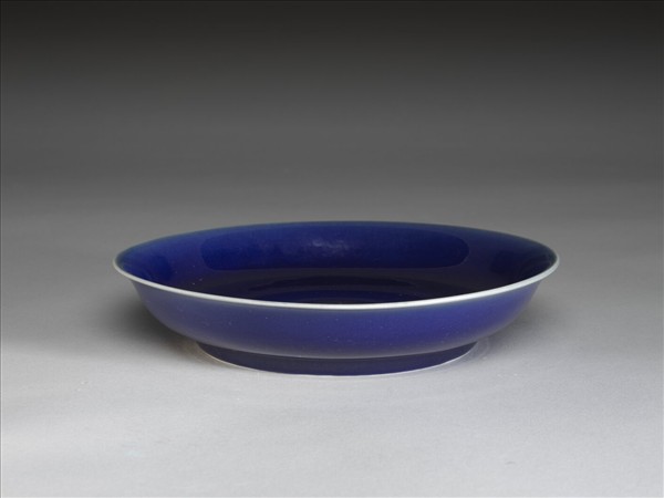 侈口窄唇,淺弧形壁,矮圈足。全器施霽青釉,施釉至足邊,口沿與足邊各留一道白邊,足緣無釉露白胎。足內壁及底施白釉。