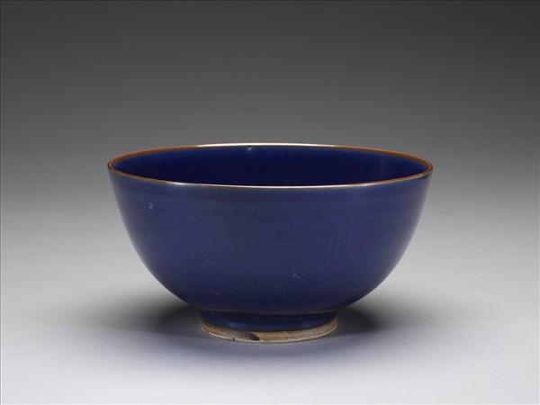 敞口,深壁,矮圈足。外壁淺劃雙雲龍紋。胎骨厚重,釉色深青,口沿施赭色釉,足內壁及底露胎,塗赭色護胎汁。