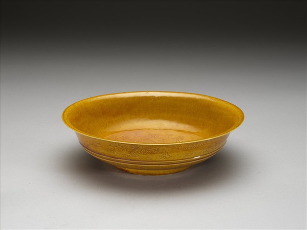侈口窄唇,深壁,矮圈足。盤心錐劃雙雲龍戲珠紋,內壁樸素無紋飾。外壁中間飾弦紋二道,上下各錐劃雙雲龍戲珠紋。薄胎骨,內外滿施嬌黃釉。