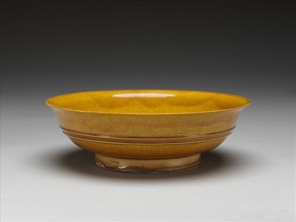 侈口窄唇,深壁,矮圈足。盤心錐劃雙雲龍戲珠紋,內壁樸素無紋飾。外壁中間飾弦紋二道,上下各錐劃雙雲龍戲珠紋。薄胎骨,內外滿施嬌黃釉。