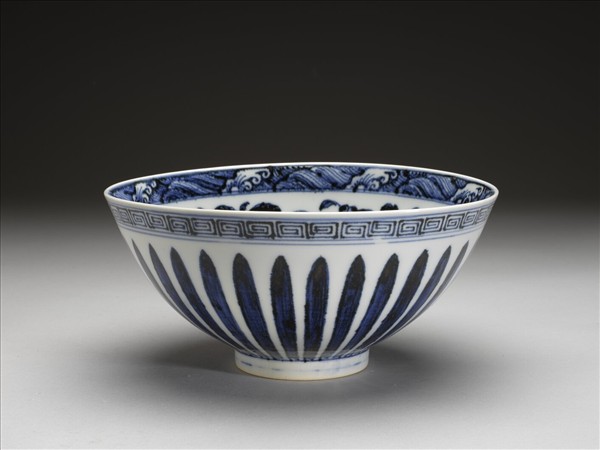 敞口,深壁上豐下斂,尖底,矮圈足,通稱「蓮子碗」。內口沿下畫波濤紋一周,加飾青線三道,周壁畫纏枝牡丹、菊花各三朵,碗心畫枇杷一枝,邊飾雙線。外口沿下畫回紋一周,加飾青線三道,周壁畫菊瓣紋,足飾青線二道。