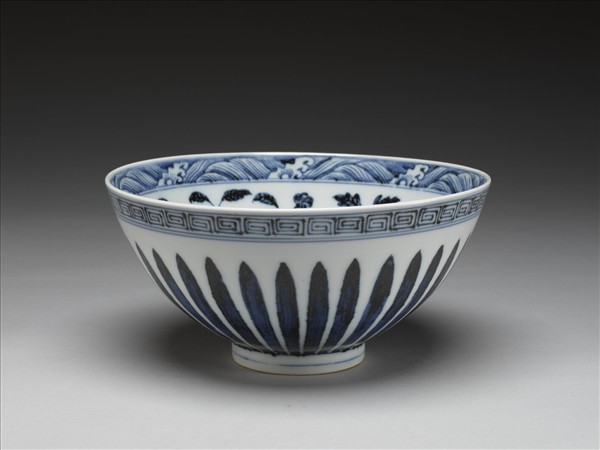 敞口,深壁上豐下斂,尖底,矮圈足,通稱「蓮子碗」。內口沿下畫波濤紋一周,加飾青線三道,周壁畫纏枝牡丹、菊花各三朵,碗心畫枇杷一枝,邊飾雙線。外口沿下畫回紋一周,加飾青線三道,周壁畫菊瓣紋,足飾青線二道。