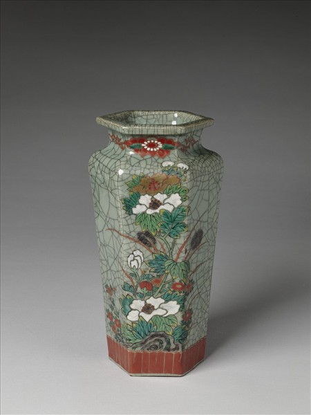 青瓷加彩花鳥紋六方瓶