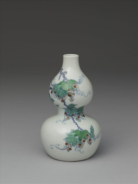 葫蘆瓶,器身呈葫蘆形,矮圈足。器表彩繪葡萄紋,葡萄色澤多樣且淡雅,葉片與藤蔓環繞器身。葫蘆下半段畫一隻淡灰色松鼠,尾巴翹起。足底緣無釉露胎,內底施釉並以青花書「大清雍正年製」三行楷款。因為葡萄多果實的形象寓意「豐收」,而鼠在十二生肖中有「多子」的意涵,所以松鼠葡萄紋通常象徵「多子、豐收」。