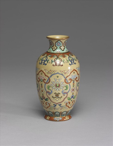 撇口,短頸,斜肩,長腹,矮圈足。全器內外壁施米黃色釉為地,外底足內亦施釉。口沿塗金彩,頸部繪接連如意雲紋,以綠色捲葉紋為地,上繪朵花圖案。肩部以紅地金彩葉紋為地,並飾交纏卷草花紋。腹壁上繪飾相互勾連的如意雲紋開光共四組,雲紋上大下小,內部裝飾一朵番蓮花。開光間也以如意雲紋相接。腹底繪飾一周仰蓮瓣紋。足外壁以紅地金彩葉紋為地,並繪飾朵花圖案。圈足底緣無釉露胎,底印「大清乾隆年製」篆書款。據廖寶秀研究,此器上的紋飾圖案明顯受到西洋繪畫技法的影響,各層紋飾以琺瑯白料點染光影亮點,表現出明暗立體的效果。