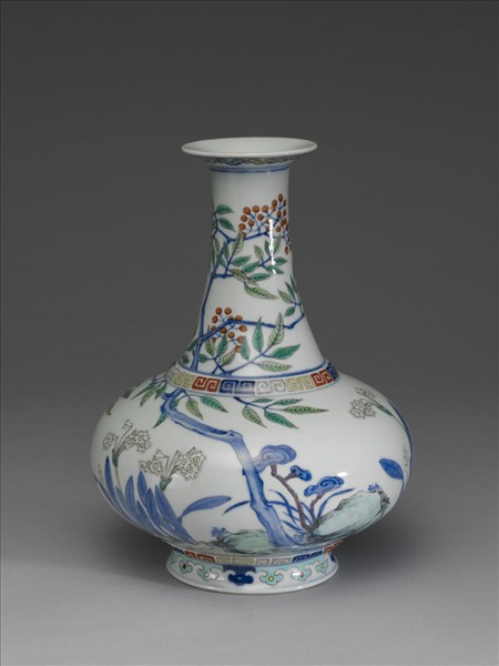 盤形撇口,長頸,豐肩,扁碩腹,圈足外撇。口圓下飾如意雲頭紋一周,瓶面畫天竹、水仙、靈芝及石草,象徵「群仙祝壽」。頸腹之間與腹底各有兩道凸稜,飾回紋,足圈飾如意雲頭頭紋,上下共畫青線十道。