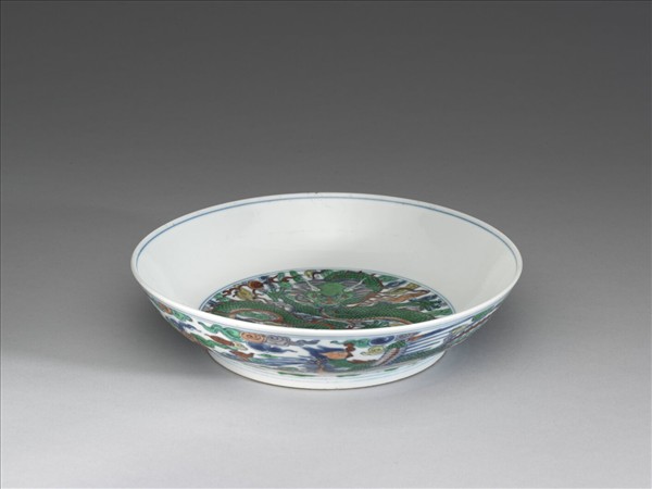 侈口,淺壁,平底,矮圈足。全器以白釉為地,外底足內亦施釉,足緣露胎。外壁口緣與圈足各飾青線兩道,並繪飾龍與鳳凰,龍身狹長,短吻,五爪,正追逐前方火珠;鳳凰作回首姿勢,隙地滿飾五彩朵雲紋,底部為綠色波濤紋。盤內壁口緣與盤心各繪青線兩道,盤心雙圈內繪綠色團龍戲珠圖案,隙地滿飾五彩雲紋。外底書「大清康熙年製」雙圈青花楷書款。青花五彩的製作以此件為例,是先燒成釉下青花,於釉上加繪五彩後,再入窯第二次以低溫燒製而成。