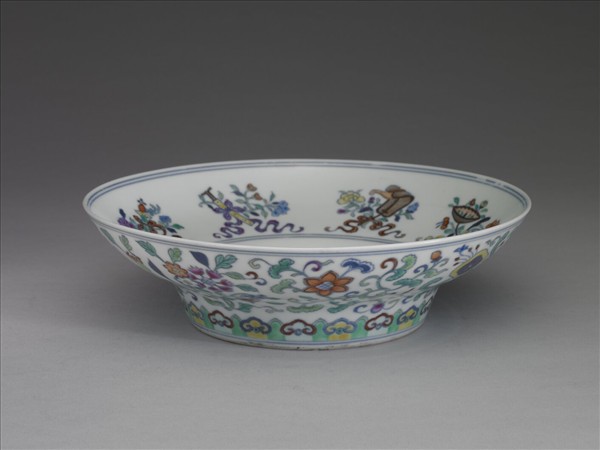 侈口,淺壁,折腰,矮圈足。足緣露胎。外壁口緣與圈足各飾青線兩道,並繪飾四種花卉圖案共兩組,周圍環繞葉紋與小型朵花。圈足外壁飾一周仰蓮瓣紋,蓮瓣上方裝飾如意雲頭圖案。盤內壁由盤心至口緣共繪三組雙道青線,盤心雙圈內畫桃花紋,周圍環繞綠色勾連紋。周壁彩畫陰陽板、葫蘆、寶劍、魚鼓、扇子、蓮葉(因美觀因素取代笊籬)、橫笛、花籃,皆為八仙所持物品,稱之為「暗八仙」。外底書「大清道光年製」青花篆書款。青花五彩的製作以此件為例,是先燒成釉下青花,於釉上加繪五彩後,再入窯第二次以低溫燒製而成。