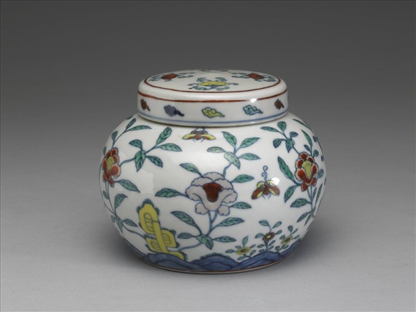 短頸碩腹罐,平底內凹成足,帶蓋。外壁以釉下鈷藍勾出物像、再填飾黃、紅、淡紫、綠色釉上多彩以成裝飾紋樣。蓋頂等距飾四朵如意雲狀的靈芝。器外壁近底處有如三角形花瓣的連綿坡石一圈,上有三個形狀怪異的湖石,湖石兩側各岐出一株盛開花卉,這六株盛開花卉的繁茂枝葉佔去了大部分畫面,是為器外壁的裝飾主調。花葉間點飾的蝴蝶,傳達花間蝶舞的印象,有如仿寫自然景色。但樣式重複而連續的藍色坡石,以及形狀怪異的湖石,有如取法於福山壽海的吉祥紋樣,又透著裝飾性、設計感。再加上湖石與花朵比例相距太大,則隱含在簡單花卉紋樣背後的裝飾性就更為強烈,值得細細欣賞、品味。足沿露胎一圈,底外有釉下青花書「大明成化年製」雙行六字楷款,外加雙圈。