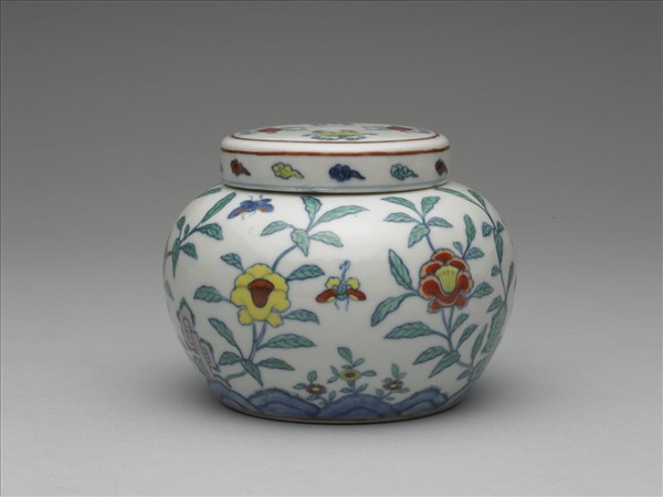 短頸碩腹罐,平底內凹成足,帶蓋。外壁以釉下鈷藍勾出物像、再填飾黃、紅、淡紫、綠色釉上多彩以成裝飾紋樣。蓋頂等距飾四朵如意雲狀的靈芝。器外壁近底處有如三角形花瓣的連綿坡石一圈,上有三個形狀怪異的湖石,湖石兩側各岐出一株盛開花卉,這六株盛開花卉的繁茂枝葉佔去了大部分畫面,是為器外壁的裝飾主調。花葉間點飾的蝴蝶,傳達花間蝶舞的印象,有如仿寫自然景色。但樣式重複而連續的藍色坡石,以及形狀怪異的湖石,有如取法於福山壽海的吉祥紋樣,又透著裝飾性、設計感。再加上湖石與花朵比例相距太大,則隱含在簡單花卉紋樣背後的裝飾性就更為強烈,值得細細欣賞、品味。足沿露胎一圈,底外有釉下青花書「大明成化年製」雙行六字楷款,外加雙圈。