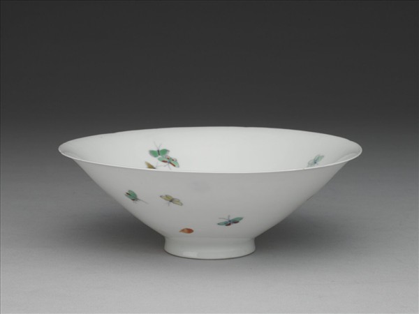 侈口碗,六瓣花口,口沿微撇,斗笠式寬斜壁,小圓足。器壁十分細薄,為半脫胎製品,色瑩白透影,器內外壁白地中,稀疏地飄落著紅色花與花瓣,並有淡綠、淺紫、淺黃色小蝶飛舞其間。花瓣暈染甚為精緻,深色染花瓣近梗之厚處,瓣尖漸淺漸淡的色調,表現花瓣薄透的樣貌。留白廣,透出淡雅之氣。器底有青花「大明成化年製」雙行六字楷款,為托名的偽款。全器見有清初康熙、雍正間風格。