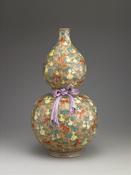 器作葫蘆形,腰際繫紫彩帶,彩帶雖由瓷土塑形而成,但於結繩處的轉折以及絲帶下垂的皺折痕等,無不如實寫真的表現出來。全器罩施橘紅色底釉,口緣描金,底足外壁畫如意雲紋,器身滿畫纏枝藤蔓與葫蘆。藤蔓綠葉有深淺之別,葫蘆果實施黃彩,局部點綴褐色斑點;蝙蝠施橘色釉彩,姿態或上或下,口部皆銜「卍」字。器內及底施湖綠色釉,底心留白以紅彩書「大清乾隆年製」六字篆款。乾隆官窯喜以吉祥圖案為飾,乾隆八年(1743),皇帝傳旨御窯廠,指示瓷器圖案的燒造務必「各按時令分別吉祥花樣」,故此品之葫蘆形,因葫蘆與「福祿」的諧音而有吉祥的象徵,而蝙蝠銜「卍」,意喻萬福。