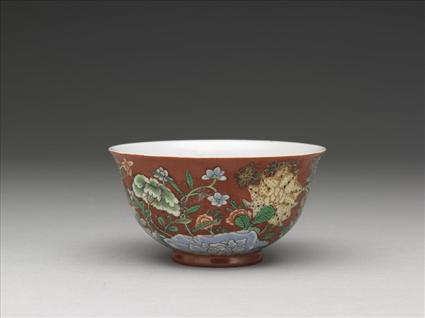 洋彩紅地四季花卉碗