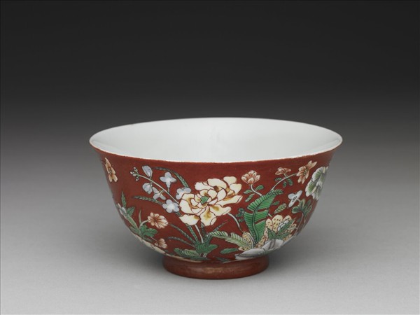 侈口碗,深弧壁,矮圈足。薄胎骨,碗內純白釉,樸素無紋飾;外壁深紅釉地,彩畫四季花卉。外底心書「康熙御製」雙行雙方框藍料宋體字款。
