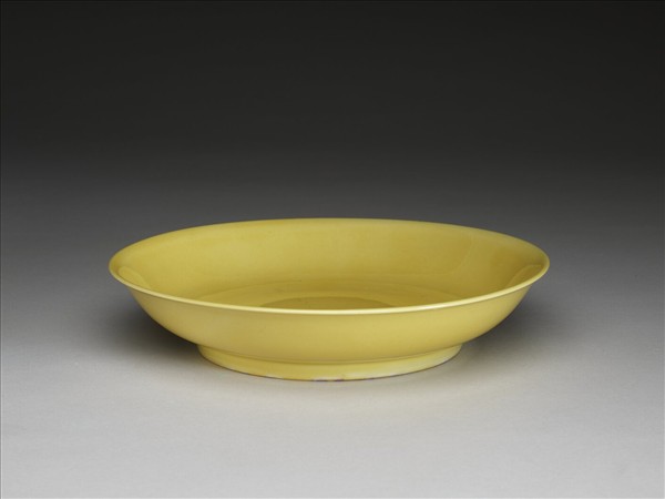 侈口窄唇,淺壁,矮圈足。胎骨稍厚,器內外壁滿施嬌黃釉,盤底純白,樸素無紋飾。底有青花書「大明嘉靖年製」二行六字楷款,外加雙圈。