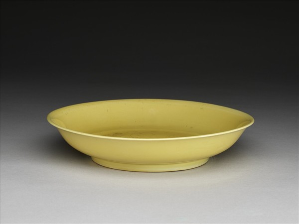 侈口窄唇,淺壁,矮圈足。胎骨稍厚,器內外壁滿施嬌黃釉,盤底純白,樸素無紋飾。底有青花書「大明嘉靖年製」二行六字楷款,外加雙圈。