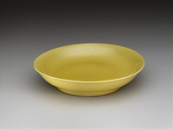 侈口窄唇,淺壁,矮圈足。胎骨稍厚,器內外壁滿施嬌黃釉,盤底純白,樸素無紋飾。底有青花書「大明嘉靖年製」二行六字楷款,外加雙圈。