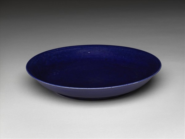 侈口,淺壁弧形,矮圈足。盤心及外壁分劃趕珠雲龍紋五條,底邊劃蓮瓣紋一周。胎質較薄,內外滿施霽青釉,盤底純白。底有青花書「大明嘉靖年製」二行六字楷款,外加雙圈。