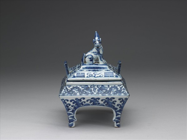 器呈四方形,口飾兩立耳,四足。蓋上立狻猊,其身下有鏤空錢紋一枚,香煙可從洞中飄出。狻猊四周繪山石、波濤。蓋沿繪八卦及風火、雲紋。爐身口沿及立耳繪回紋,腹部上層繪雙龍搶珠,下層繪波濤、浪花。底有青花楷款「大明萬曆年製」,三行、外加雙方框。胎骨厚重。口沿及蓋沿釉層微有剝缺的現象。