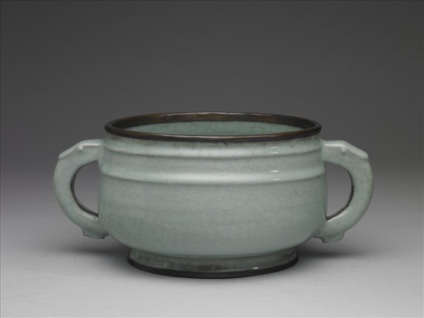 器形模仿青銅簋,斂口略呈橢圓形,碩腹,平底,圈足略高。口足磨損而加鑲銅邊,口下飾弦紋兩道,腹兩側各按飾一螭形耳,耳下削平,露出黑灰色的胎體。胎骨較厚,通體施濃潤青釉,釉色粉青,釉面滿佈冰裂紋,邊稜釉薄處微現粉色光澤。南宋紹興年間,朝野上下醞釀而出復興北宋文化的思潮,讓《宣和博古圖》成為重建禮制器用的典範。影響所及,也讓南宋官窯器中出現一類仿銅器形,此品即為其中一個例證。浙江省杭州市郊壇下官窯窯址及南宋太廟區域也曾出土相似的器類。
