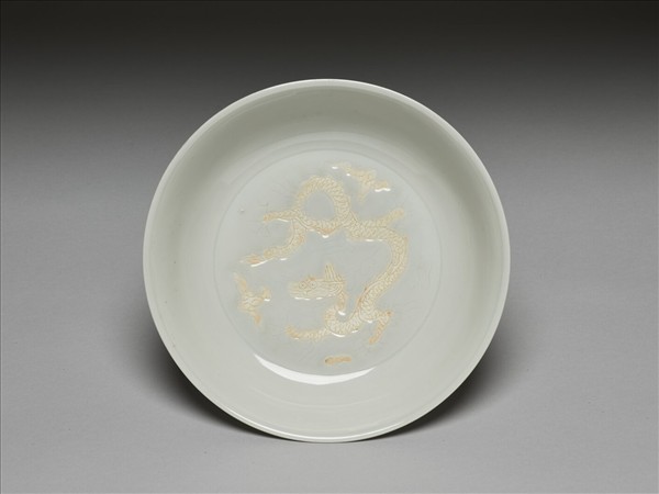 侈口,淺壁弧形,矮圈足。盤心與外壁刻畫雲龍三條,外壁隙地淺劃波濤、山石紋。內壁純白無紋飾。胎質稍厚,釉色甜白,龍紋均露胎,未施釉彩。底有青花書「大明弘治年製」二行六字楷款,外加雙圈。