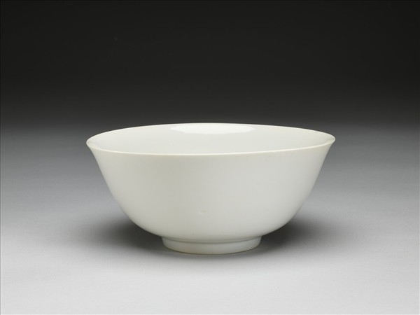 侈口,深壁,矮圈足。胎質較薄,釉色甜白,內外壁純白無紋飾。底有青花書「大明弘治年製」二行六字楷款,外加雙圈。