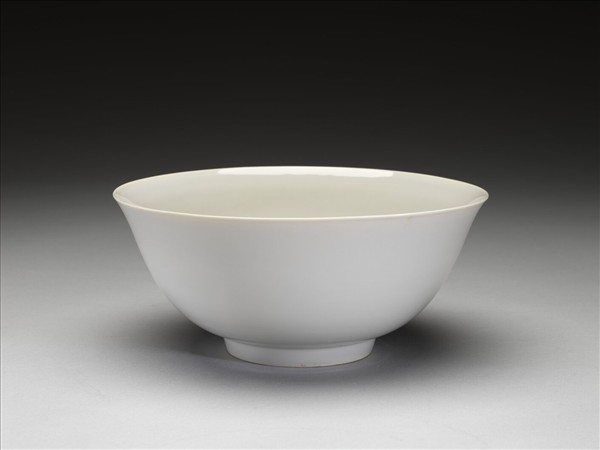 侈口,深壁,矮圈足。胎質較薄,釉色甜白,內外壁純白無紋飾。底有青花書「大明弘治年製」二行六字楷款,外加雙圈。