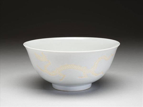 侈口,深壁,矮圈足。碗心與外壁刻畫雲龍三條,外壁隙地淺劃波濤紋。內壁純白無紋飾。釉色甜白,龍紋均露胎,未施釉彩。底有青花書「大明弘治年製」二行六字楷款,外加雙圈。