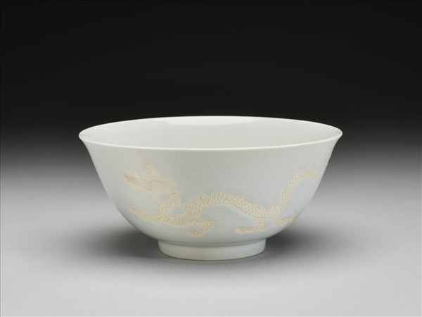 侈口,深壁,矮圈足。碗心與外壁刻畫雲龍三條,外壁隙地淺劃波濤紋。內壁純白無紋飾。釉色甜白,龍紋均露胎,未施釉彩。底有青花書「大明弘治年製」二行六字楷款,外加雙圈。